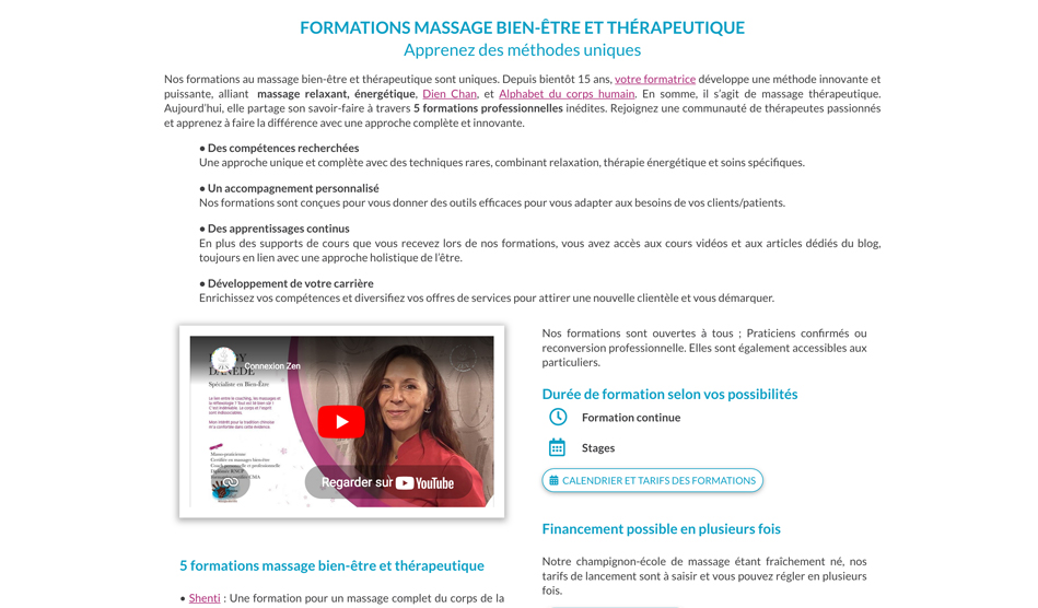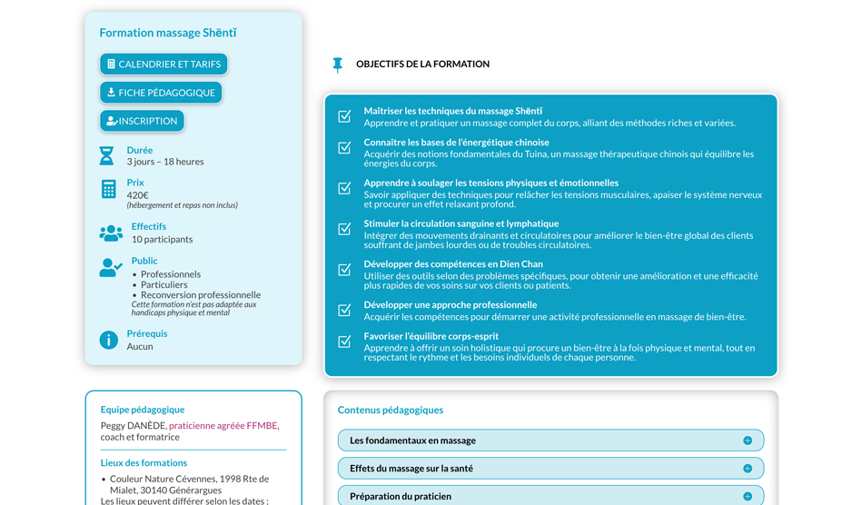 Depuis bientôt 15 ans, Peggy Danède, gérante de Connexion Zen, développe une méthode innovante et puissante, alliant massage thérapeutique, énergétique chinoise, Dien Chan, et l’alphabet du corps humain. Aujourd’hui, elle partage son savoir-faire à travers 5 formations professionnelles inédites, destinées aux praticiens du bien-être, aux masseurs, et à tous ceux qui souhaitent approfondir leurs compétences ou démarrer une activité en bien-être. Des formations alliant le massage bien-être et le massage thérapeutique.