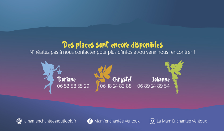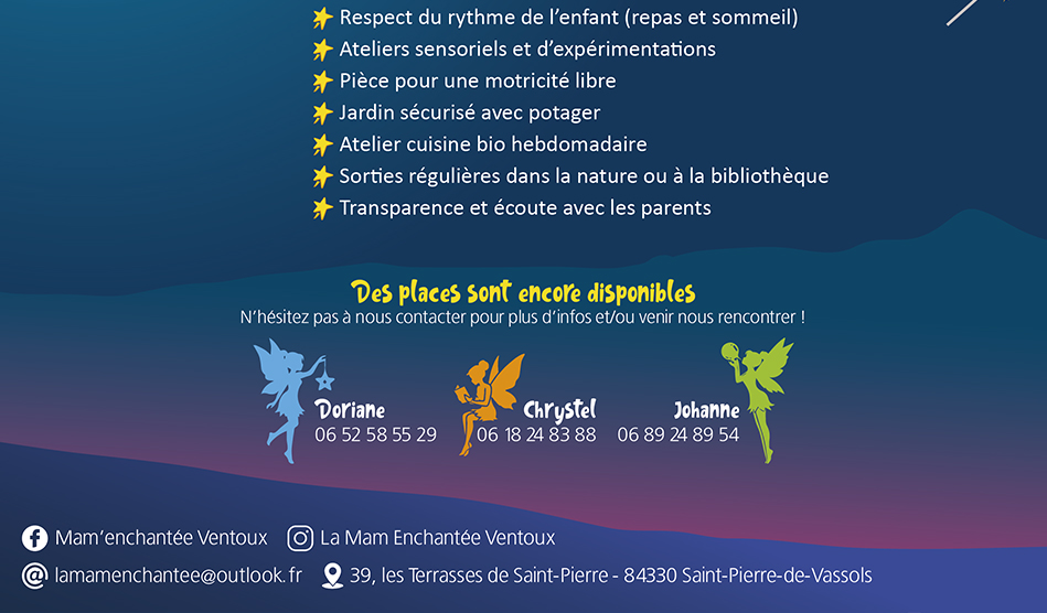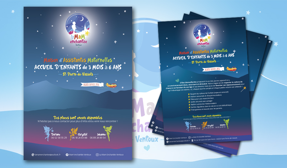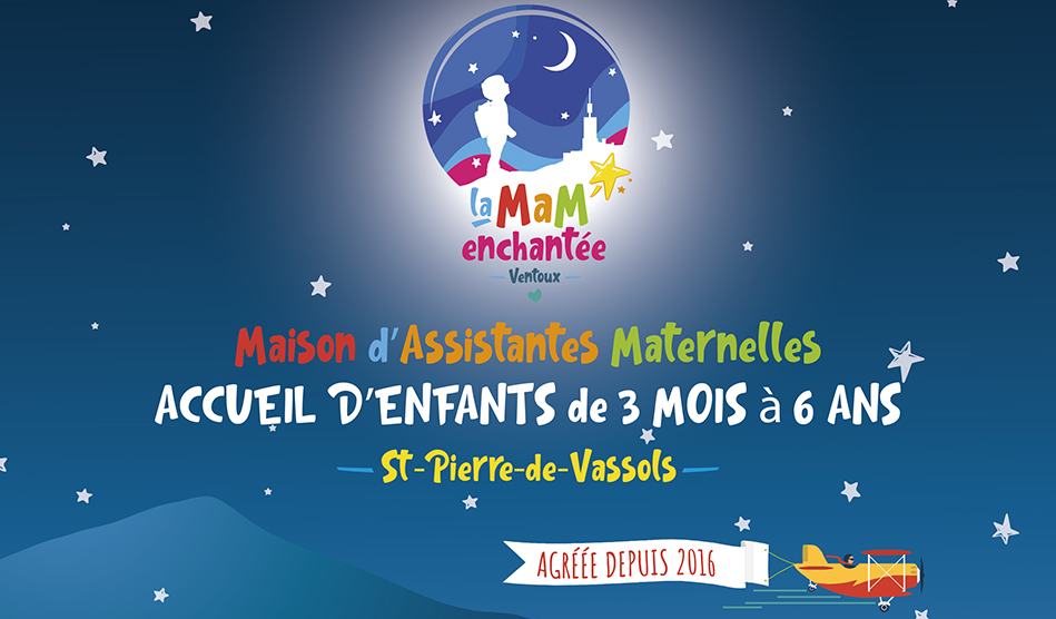 Maison d’Assistantes Maternelles, située à St Pierre de Vassol, au pied du Mont Ventoux accueillent les enfants de 3 mois a 6 ans. Cette association fête ses 20 ans cette année et en profite pour refondre leur logotype, concevoir des flyers et un panneau d’entrée.